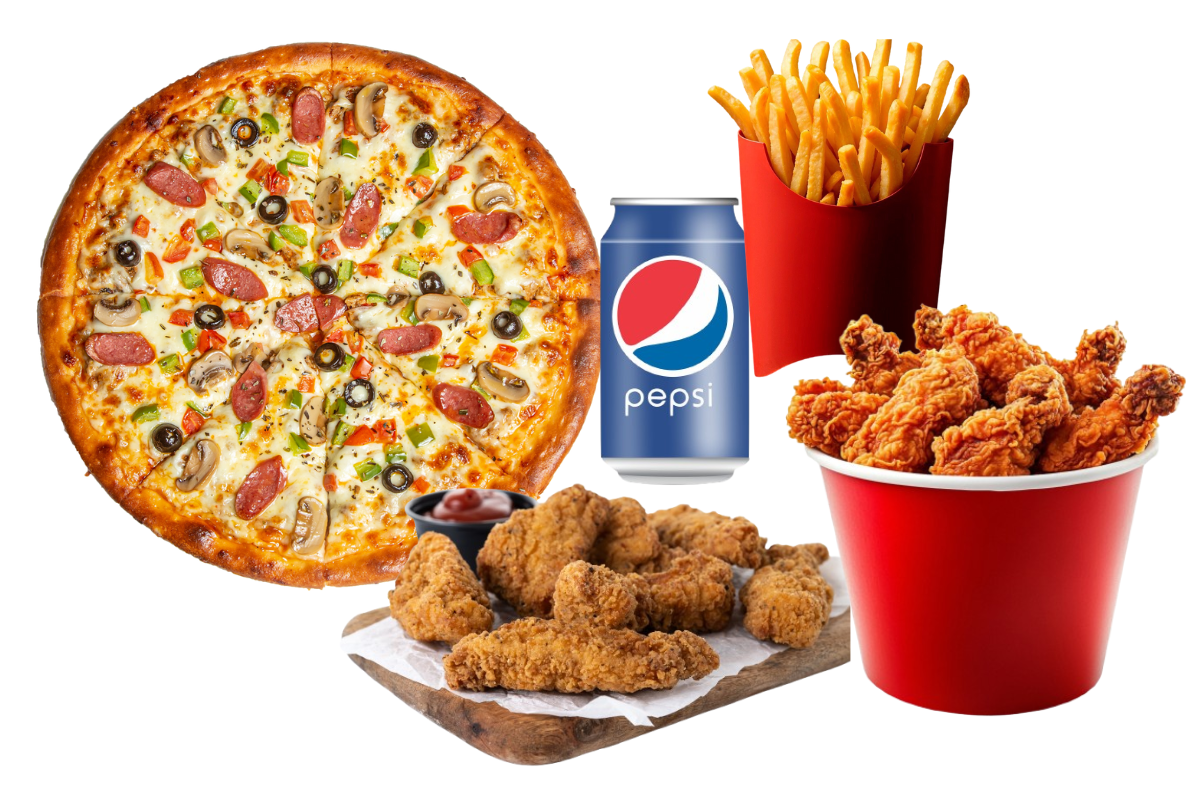 Pizza, 3 Chicken Strips, Doner, Fries, Can