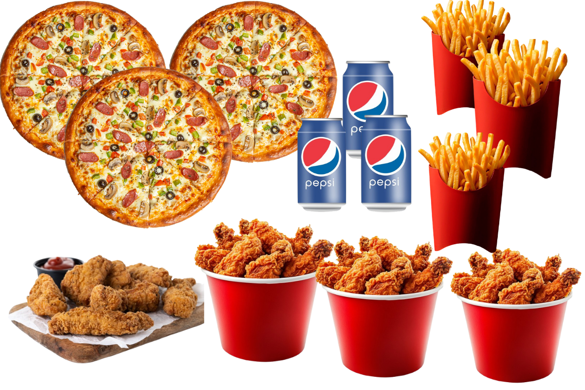 3 Pizza, 9 Chicken Strips, Doner Meat, 3 Fries, 3 Can